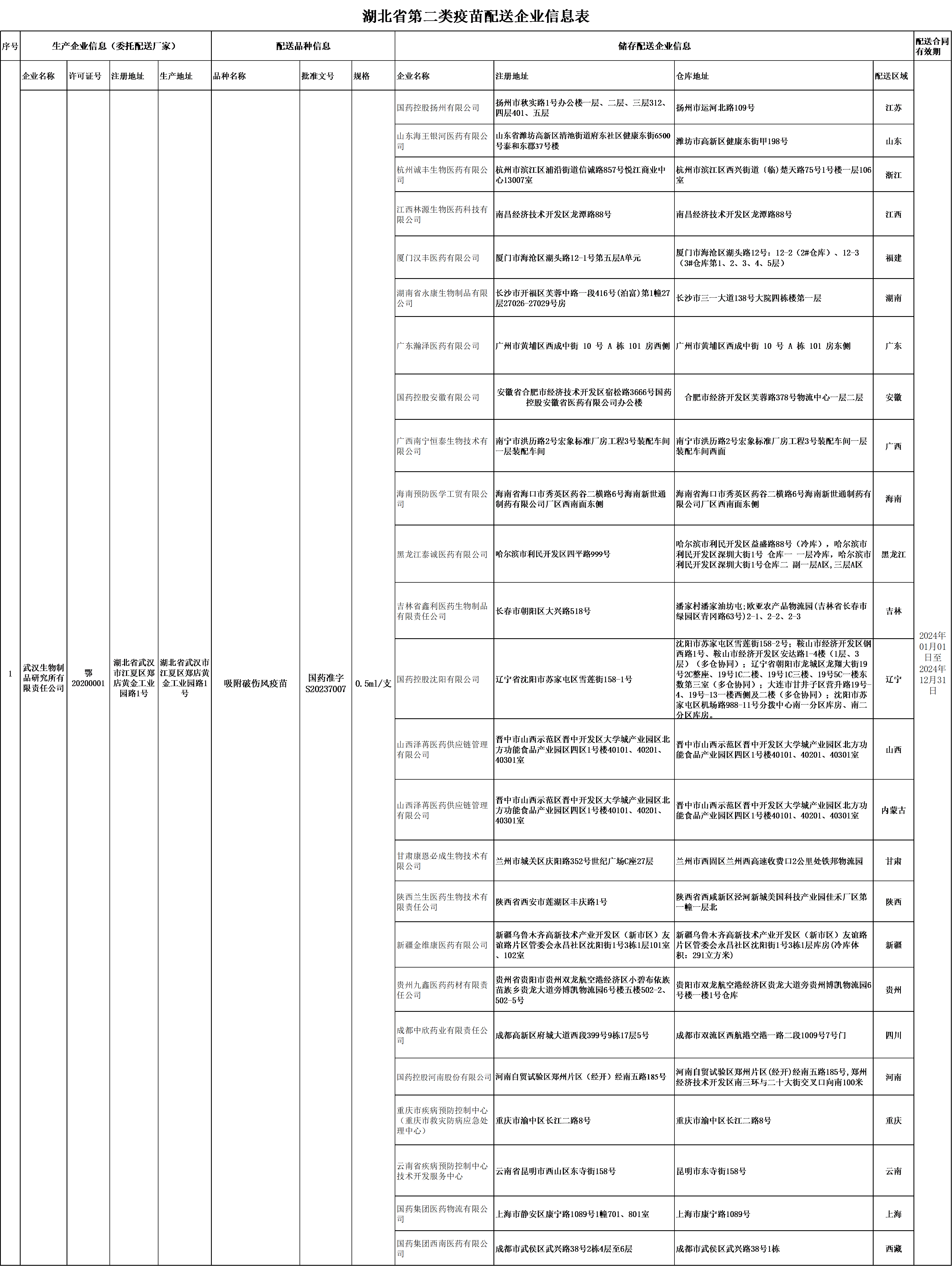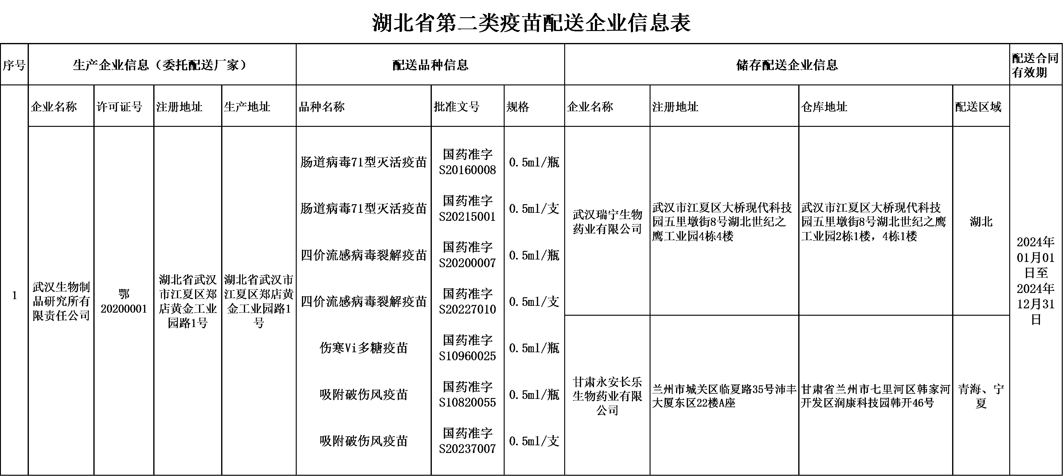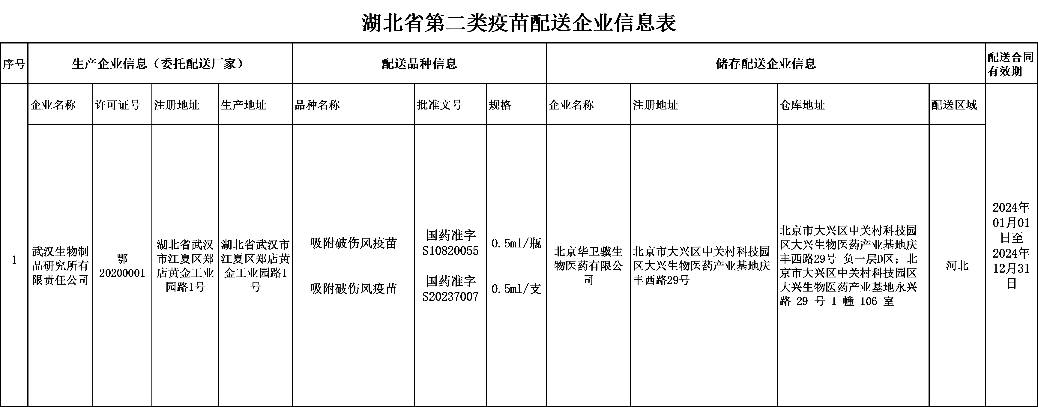 湖北省第二類疫苗配送企業(yè)信息表(武漢生物制品研究所有限責任公司)